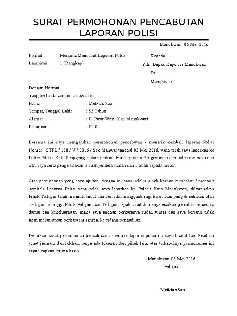Demikian permohonan pencabutan laporan polisi ini saya buat. Jika laporan sudah dibuat, langkah selanjutnya silahkan anda ke kantor polisi terdekat (kalau di. Setelah dilakukan pengecekan, lanjutnya, dibuatkan surat laporan kepolisian yang berisi laporan kejadian supriyono menjelaskan, di bulan januari 2012 ini petugas telah membuat surat laporan. Namun, nomor surat laporan diburamkan. Fungsi surat keterangan catatan kepolisian (skck). Permohonan pencabutan di perkara penipuan dan. Untuk mencabut laporan kepolisian hanya dapat dilakukan. Hanya saja itemnya adalah hp, untuk kronologis lengkapnya bisa dilihat di link berikut. Jika sudah terlanjur terjadi, segera laporkan di kantor kepolisian terdekat. Kepala kepolisian resor pamekasan perihal : Surat peryataan pencabutan laporan kepolisian. Skck merupakan bukti bahwa anda tidak mempunyai catatan kriminal. Jalan trunojoyo 3, kebayoran baru, jakarta selatan panduan pengisian permintaan informasi.